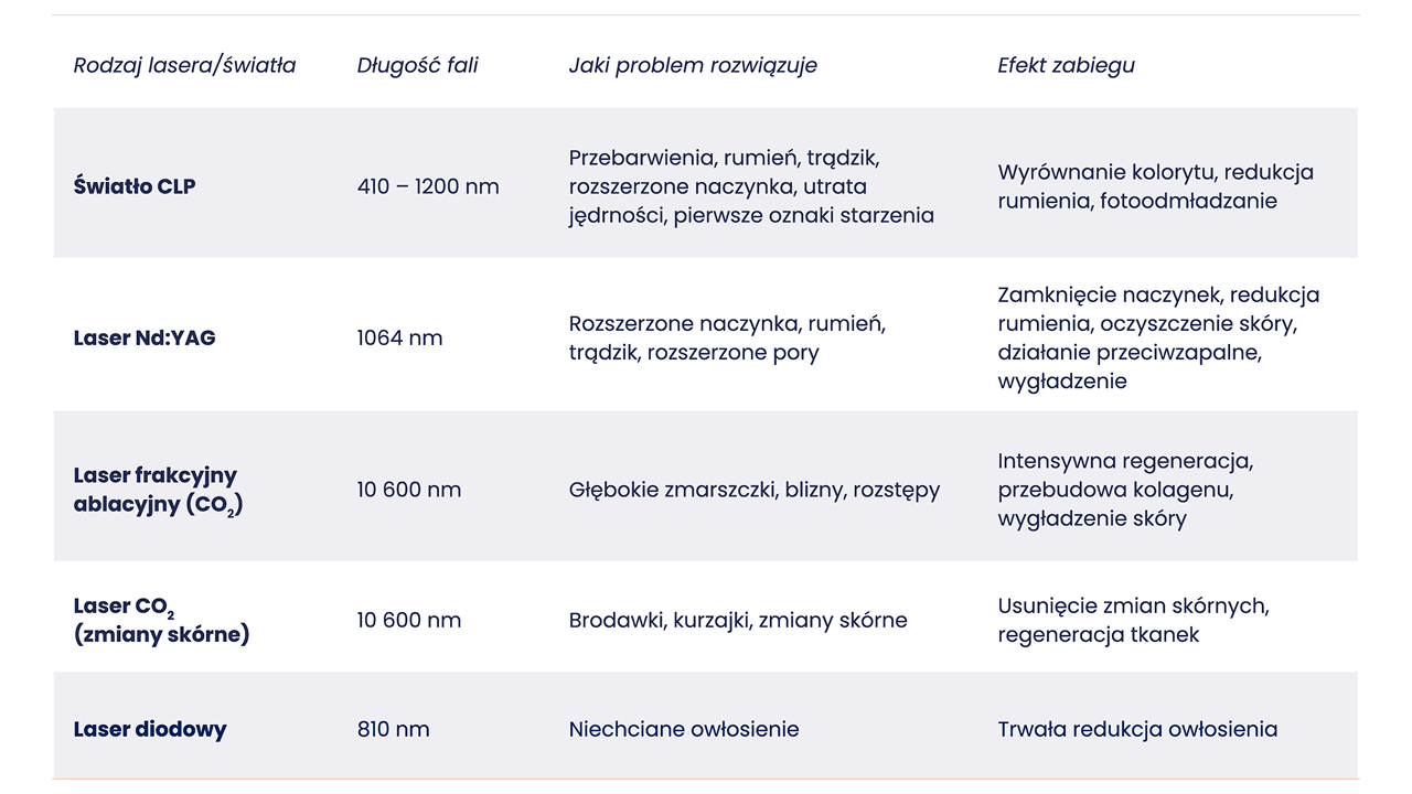 Nowoczesna kosmetologia i medycyna estetyczna coraz częściej opierają się na technologiach laserowych, które umożliwiają precyzyjne i kontrolowane oddziaływanie na skórę. Dzięki różnym długościom fali oraz mechanizmom działania lasery pozwalają m.in. redukować przebarwienia, usuwać owłosienie i tatuaże, spłycać blizny oraz poprawiać strukturę i koloryt skóry – często tam, gdzie klasyczne metody pielęgnacyjne i zabiegowe okazują się niewystarczające. W praktyce nie istnieje jednak „jeden laser do wszystkiego” – skuteczność terapii zależy od rodzaju urządzenia, jego parametrów, wskazań do zabiegu i doświadczenia specjalisty. Jakie typy laserów są najczęściej wykorzystywane i czym różnią się między sobą? Przeczytaj artykuł i dowiedz się więcej.